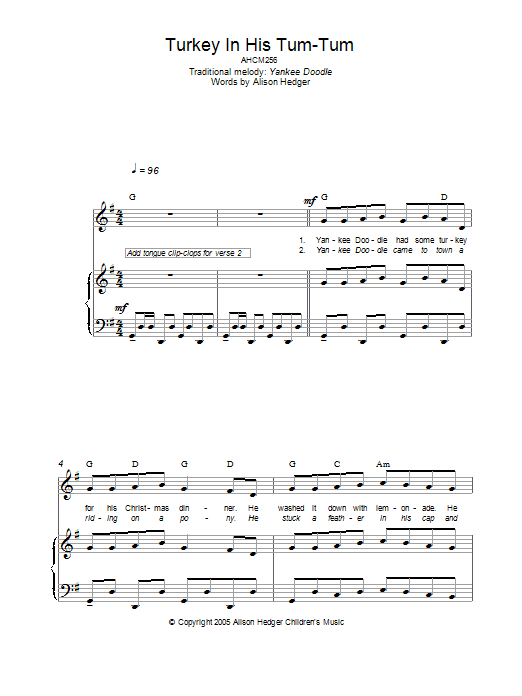 Download or print Alison Hedger Turkey In His Tum-Tum sheet music, chords and digital score arranged for Piano, Vocal & Guitar Chords. This Children score includes 2 page(s).