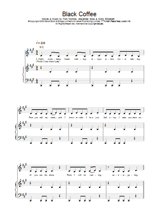 Download or print All Saints Black Coffee sheet music, chords and digital score arranged for Piano, Vocal & Guitar Chords. This Pop score includes 7 page(s).