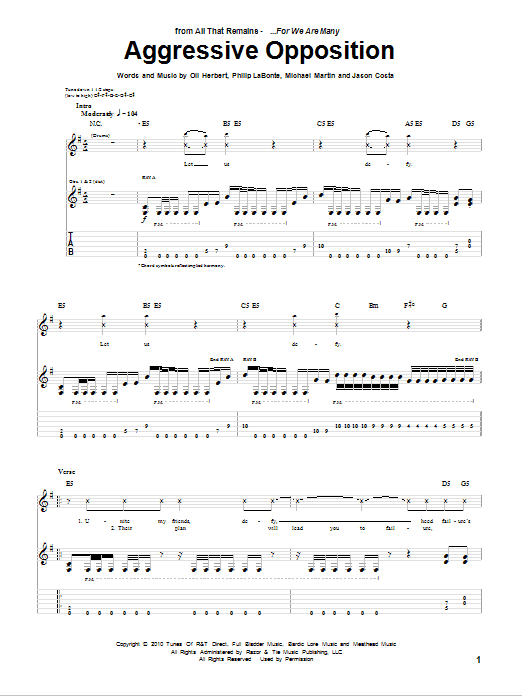 Download or print All That Remains Aggressive Opposition sheet music, chords and digital score arranged for Guitar Tab. This Metal score includes 12 page(s).