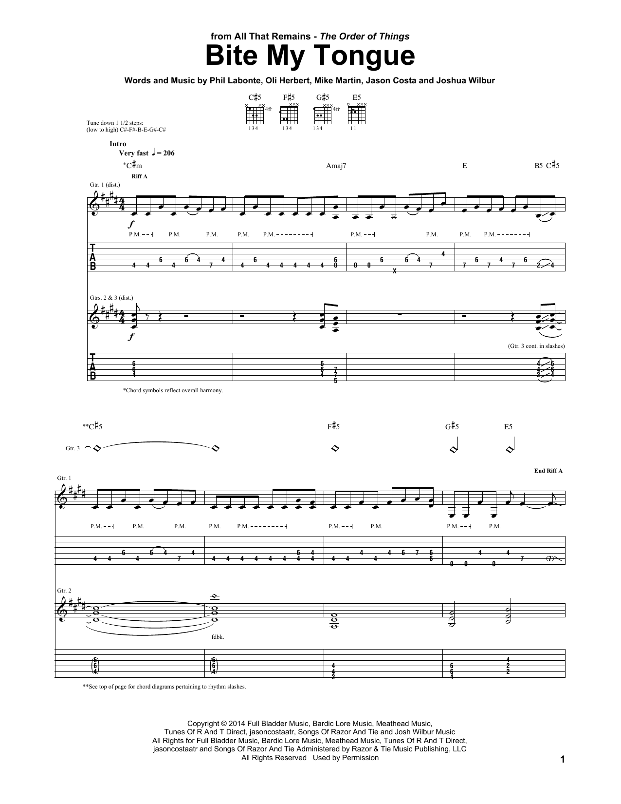 Download or print All That Remains Bite My Tongue sheet music, chords and digital score arranged for Guitar Tab. This Pop score includes 13 page(s).