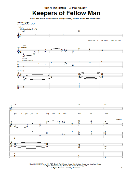 Download or print All That Remains Keepers Of Fellow Man sheet music, chords and digital score arranged for Guitar Tab. This Metal score includes 9 page(s).