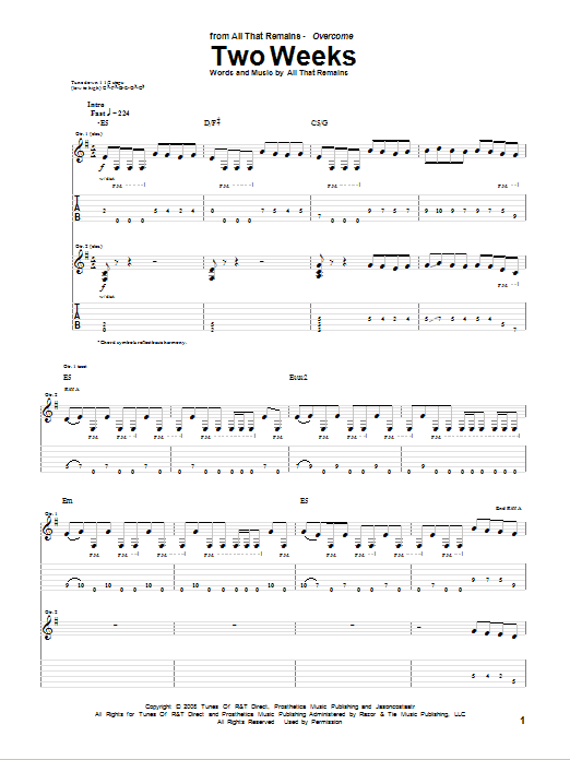 Download or print All That Remains Two Weeks sheet music, chords and digital score arranged for Guitar Tab (Single Guitar). This Metal score includes 10 page(s).