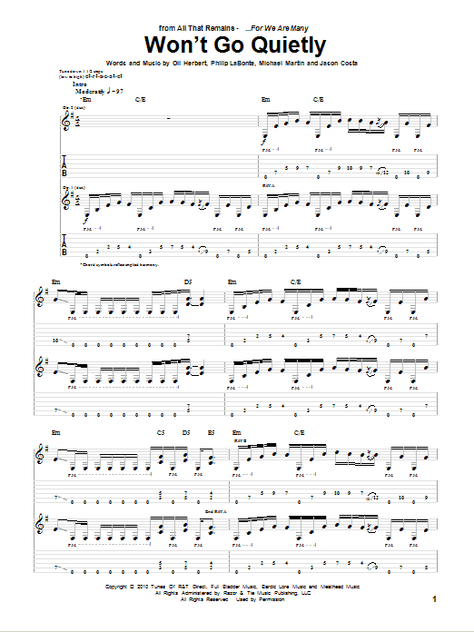 Download or print All That Remains Won't Go Quietly sheet music, chords and digital score arranged for Guitar Tab. This Metal score includes 10 page(s).