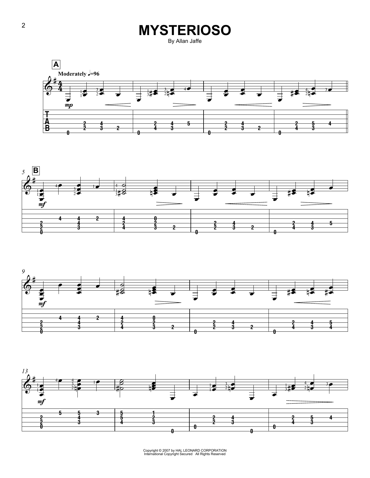 Download or print Allan Jaffe Mysterioso sheet music, chords and digital score arranged for Easy Guitar Tab. This Instructional score includes 3 page(s).