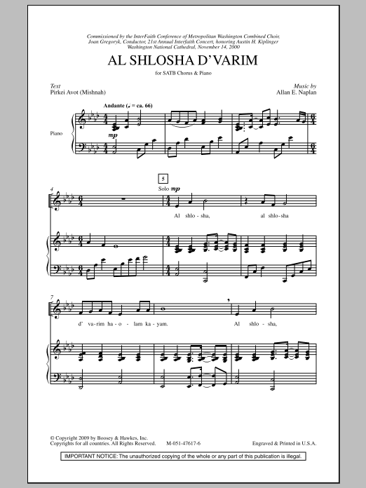 Download or print Allan Naplan Al Shlosha D'Varim sheet music, chords and digital score arranged for SATB Choir. This Classical score includes 9 page(s).