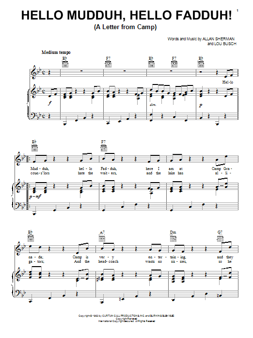 Download or print Allan Sherman Hello Mudduh, Hello Fadduh! (A Letter From Camp) sheet music, chords and digital score arranged for Banjo Tab. This Children score includes 3 page(s).