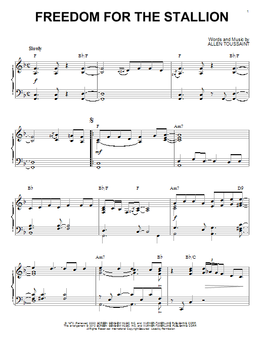 Download or print Allen Toussaint Freedom For The Stallion (arr. Brent Edstrom) sheet music, chords and digital score arranged for Piano Solo. This Jazz score includes 3 page(s).