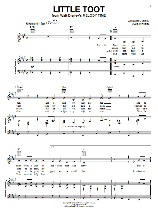 Download or print Allie Wrubel Little Toot sheet music, chords and digital score arranged for Piano, Vocal & Guitar Chords (Right-Hand Melody). This Children score includes 8 page(s).