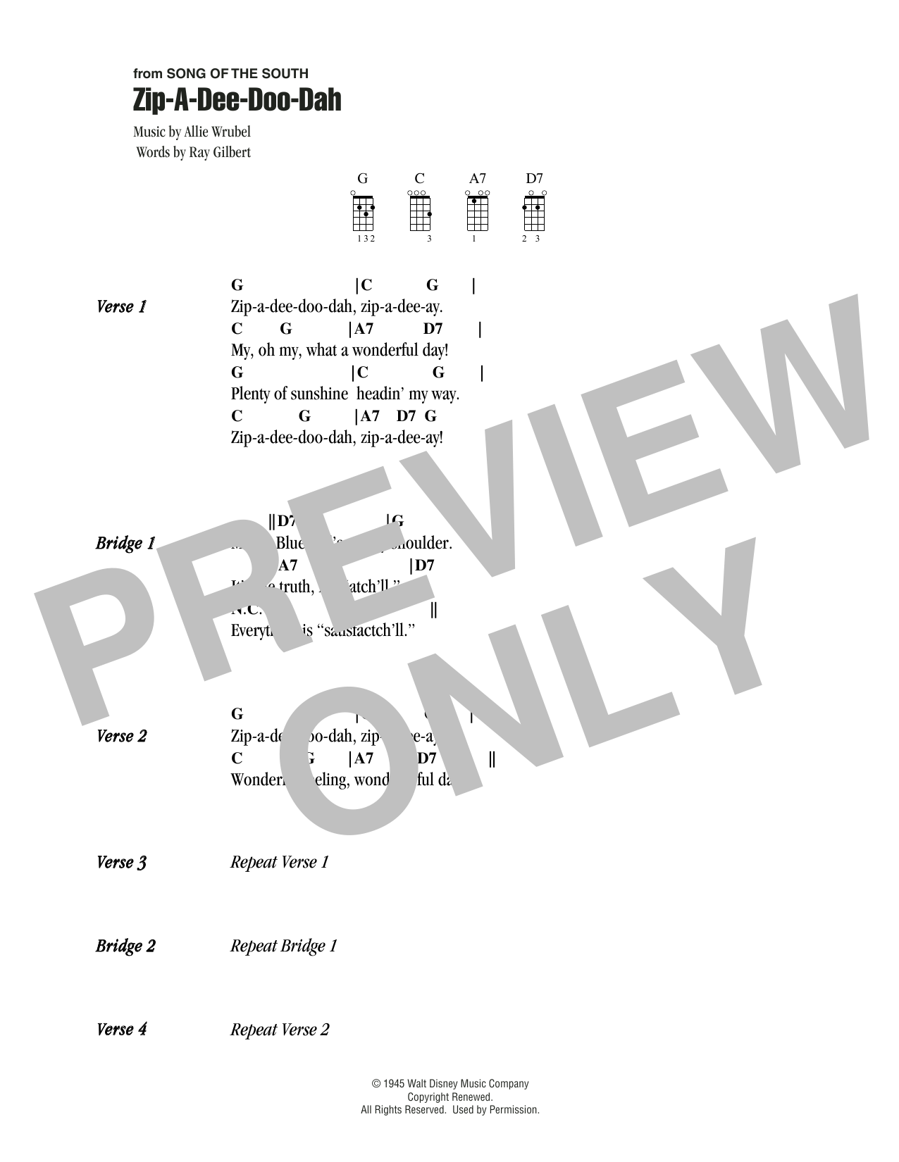 Download or print Allie Wrubel Zip-A-Dee-Doo-Dah sheet music, chords and digital score arranged for Ukulele Chords/Lyrics. This Children score includes 1 page(s).