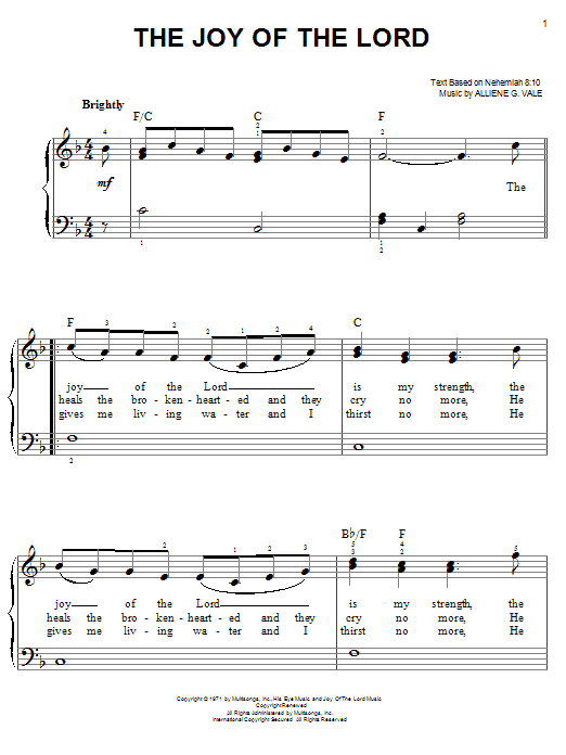 Download or print Alliene G. Vale The Joy Of The Lord sheet music, chords and digital score arranged for Easy Piano. This Children score includes 2 page(s).