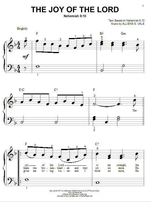 Download or print Alliene G. Vale The Joy Of The Lord sheet music, chords and digital score arranged for Big Note Piano. This Children score includes 2 page(s).