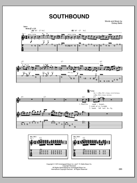 Download or print Allman Brothers Band Southbound sheet music, chords and digital score arranged for Piano, Vocal & Guitar Chords (Right-Hand Melody). This Rock score includes 7 page(s).