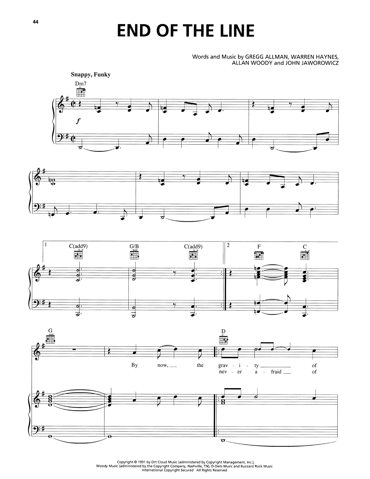 Download or print Allman Brothers End Of The Line sheet music, chords and digital score arranged for Piano, Vocal & Guitar Chords (Right-Hand Melody). This Rock score includes 8 page(s).