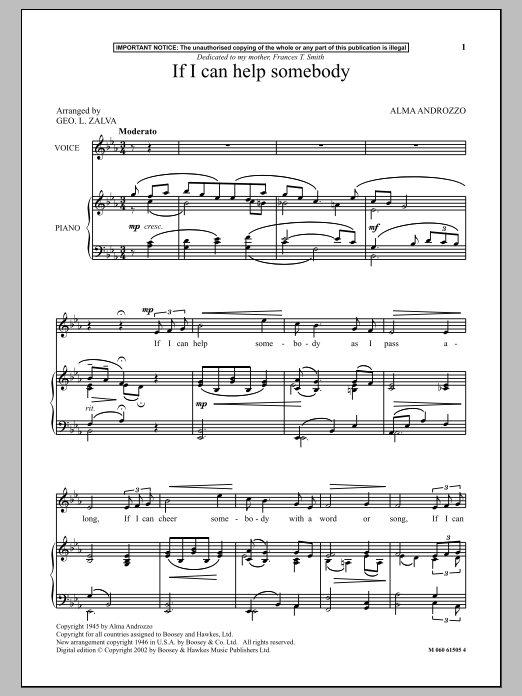 Download or print Alma Androzzo If I Can Help Somebody sheet music, chords and digital score arranged for Piano & Vocal. This Classical score includes 4 page(s).