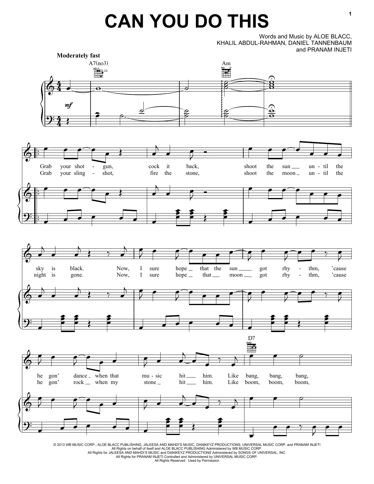 Download or print Aloe Blacc Can You Do This sheet music, chords and digital score arranged for Piano, Vocal & Guitar Chords (Right-Hand Melody). This Pop score includes 6 page(s).