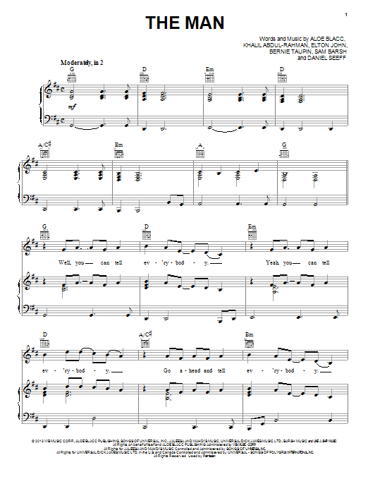 Download or print Aloe Blacc The Man sheet music, chords and digital score arranged for Piano, Vocal & Guitar Chords (Right-Hand Melody). This Pop score includes 11 page(s).