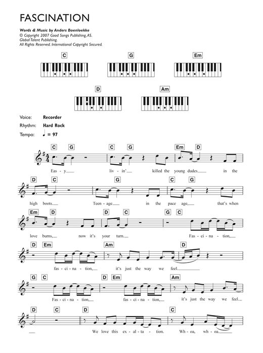 Download or print Alphabeat Fascination sheet music, chords and digital score arranged for Piano Chords/Lyrics. This Pop score includes 2 page(s).