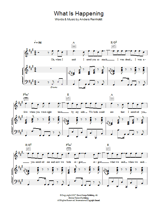 Download or print Alphabeat What Is Happening sheet music, chords and digital score arranged for Piano, Vocal & Guitar Chords. This Pop score includes 6 page(s).