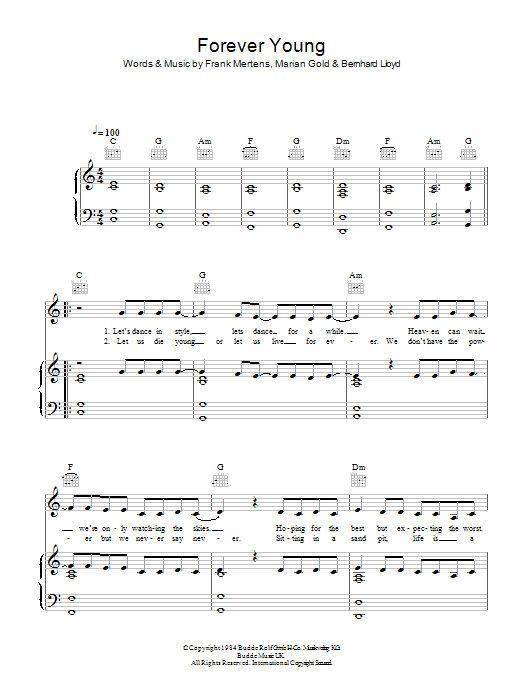 Download or print Alphaville Forever Young sheet music, chords and digital score arranged for Piano, Vocal & Guitar Chords. This Alternative score includes 5 page(s).