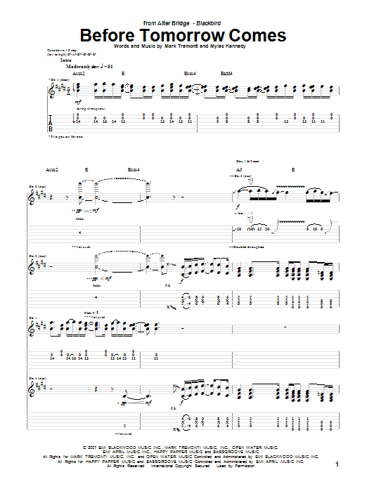 Download or print Alter Bridge Before Tomorrow Comes sheet music, chords and digital score arranged for Guitar Tab. This Metal score includes 9 page(s).