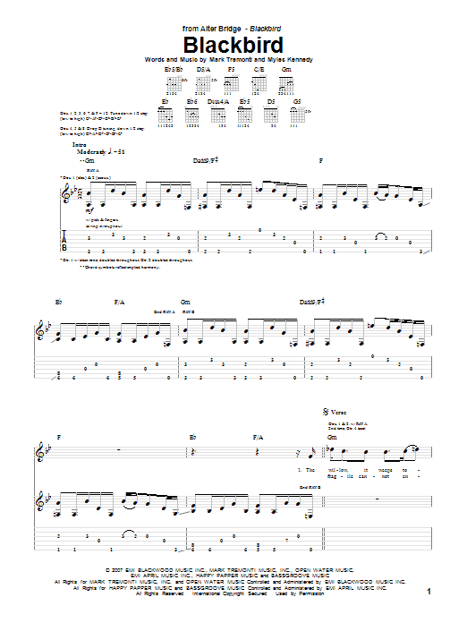 Download or print Alter Bridge Blackbird sheet music, chords and digital score arranged for Guitar Tab. This Metal score includes 16 page(s).