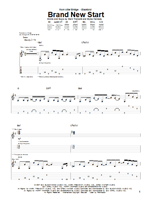 Download or print Alter Bridge Brand New Start sheet music, chords and digital score arranged for Guitar Tab. This Metal score includes 11 page(s).