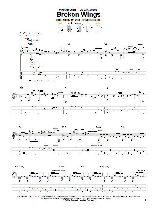 Download or print Alter Bridge Broken Wings sheet music, chords and digital score arranged for Guitar Tab. This Metal score includes 8 page(s).