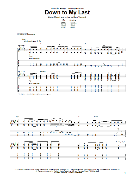 Download or print Alter Bridge Down To My Last sheet music, chords and digital score arranged for Guitar Tab. This Metal score includes 11 page(s).