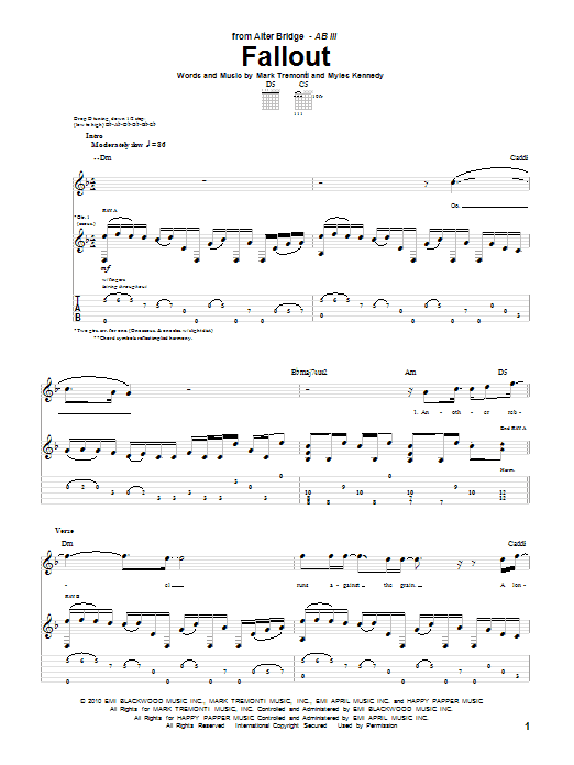 Download or print Alter Bridge Fallout sheet music, chords and digital score arranged for Guitar Tab. This Metal score includes 11 page(s).