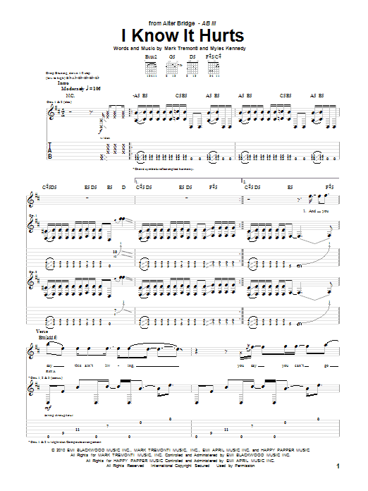 Download or print Alter Bridge I Know It Hurts sheet music, chords and digital score arranged for Guitar Tab. This Metal score includes 8 page(s).