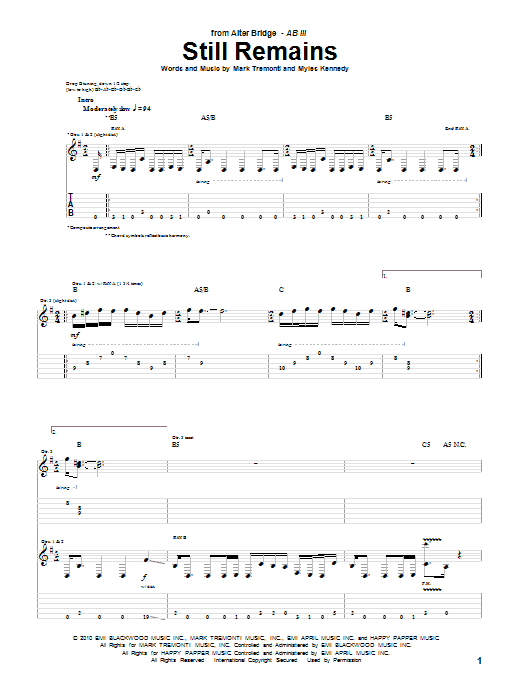 Download or print Alter Bridge Still Remains sheet music, chords and digital score arranged for Guitar Tab. This Metal score includes 9 page(s).