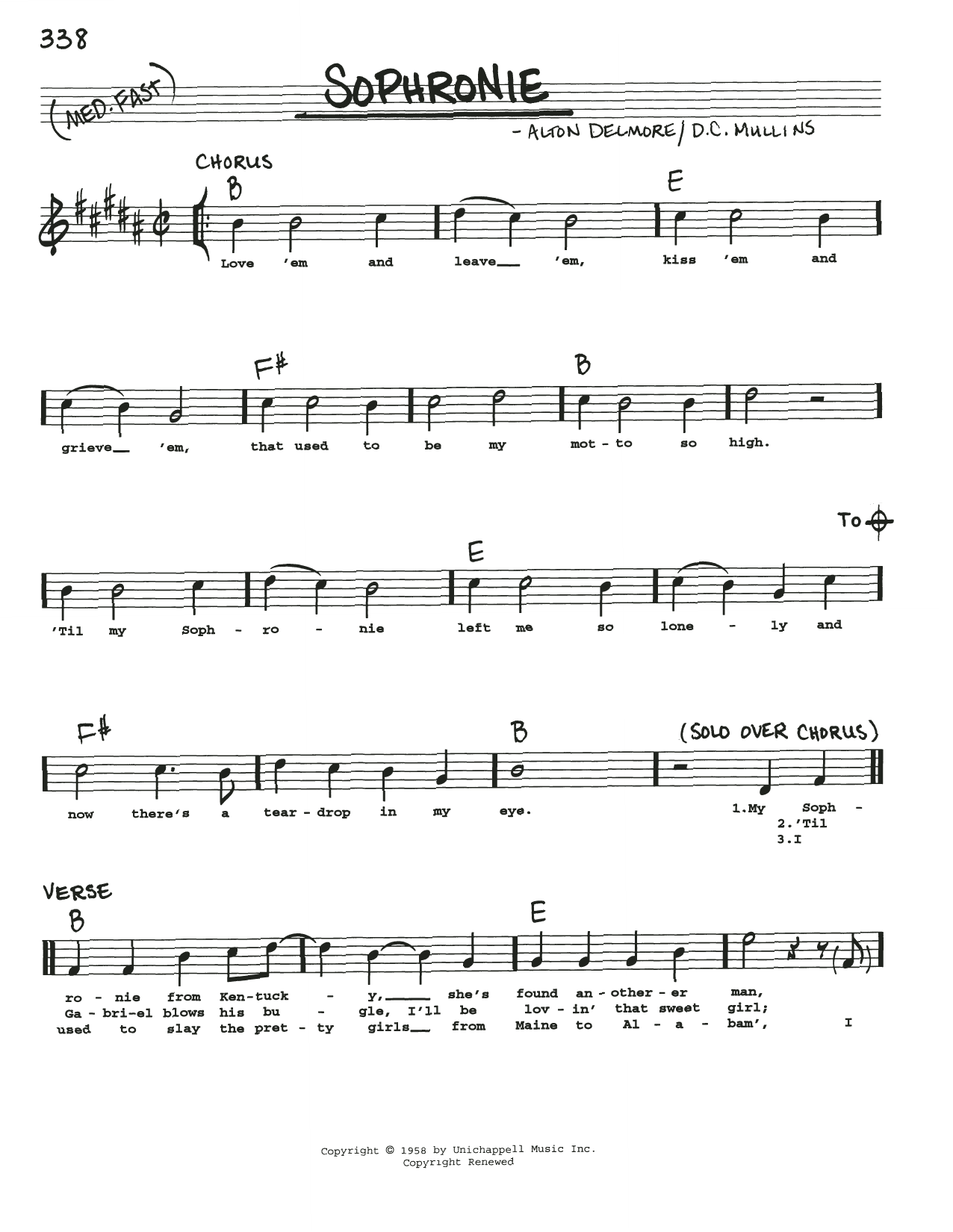 Download or print Alton Delmore Sophronie sheet music, chords and digital score arranged for Real Book – Melody, Lyrics & Chords. This Jazz score includes 2 page(s).
