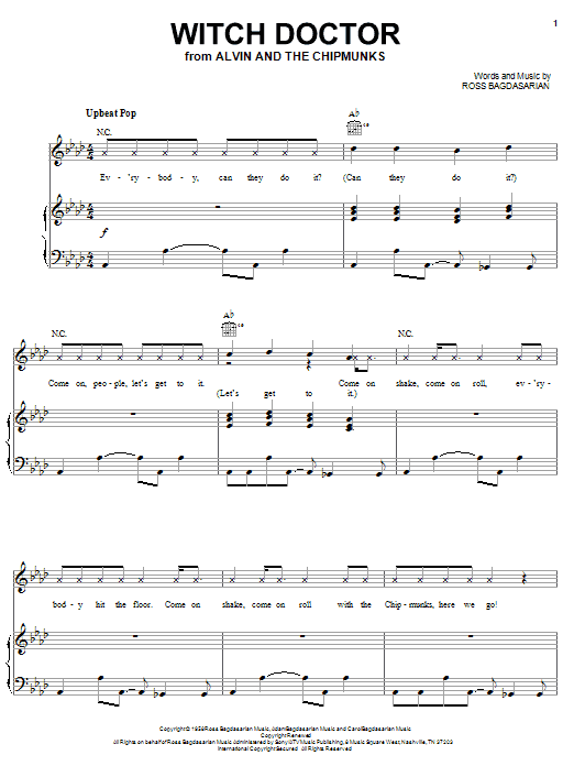 Download or print Alvin And The Chipmunks Witch Doctor sheet music, chords and digital score arranged for Piano, Vocal & Guitar Chords (Right-Hand Melody). This Children score includes 8 page(s).