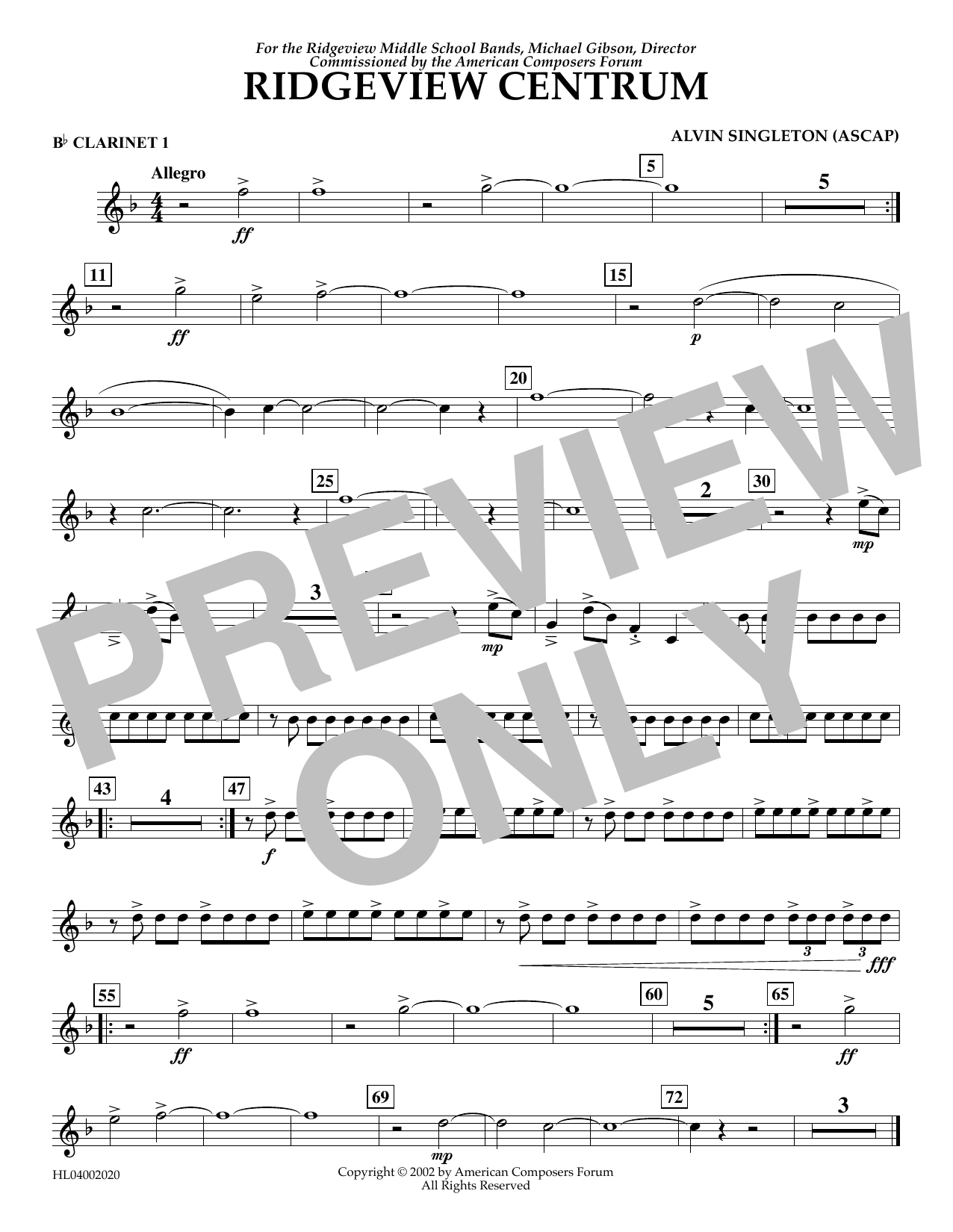 Download or print Alvin Singleton Ridgeview Centrum - Bb Clarinet 1 sheet music, chords and digital score arranged for Concert Band. This Concert score includes 1 page(s).
