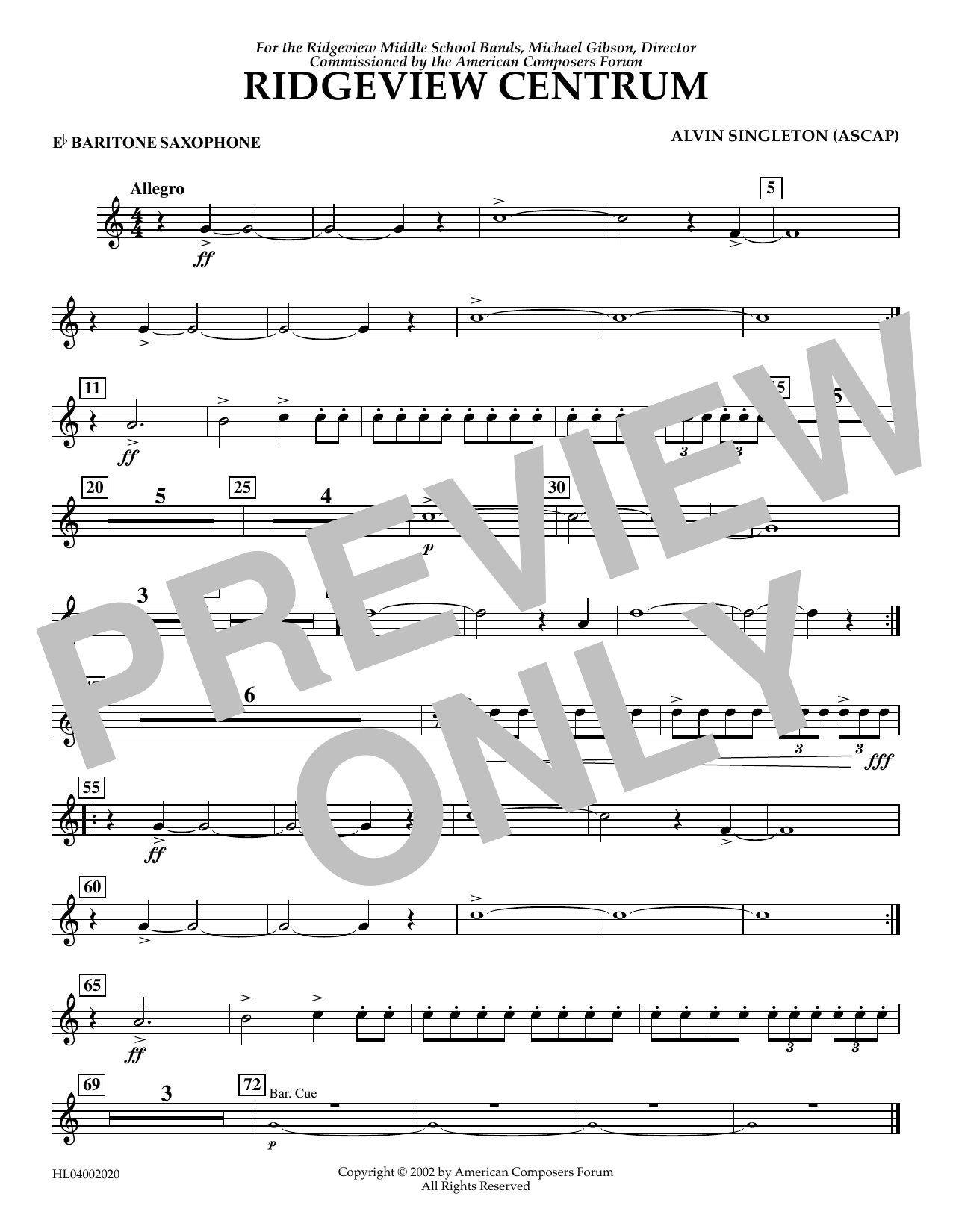 Download or print Alvin Singleton Ridgeview Centrum - Eb Baritone Saxophone sheet music, chords and digital score arranged for Concert Band. This Concert score includes 1 page(s).