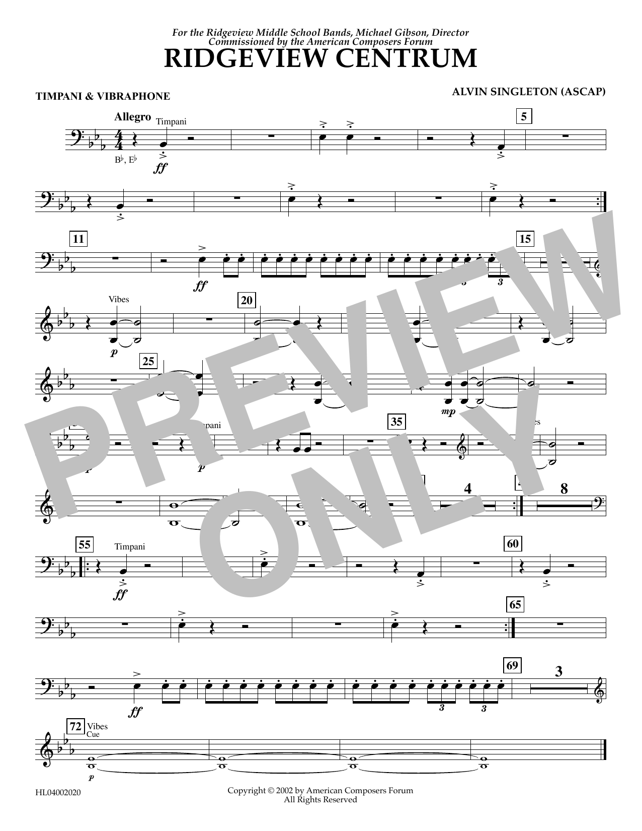 Download or print Alvin Singleton Ridgeview Centrum - Timpani, Vibraphone sheet music, chords and digital score arranged for Concert Band. This Concert score includes 1 page(s).