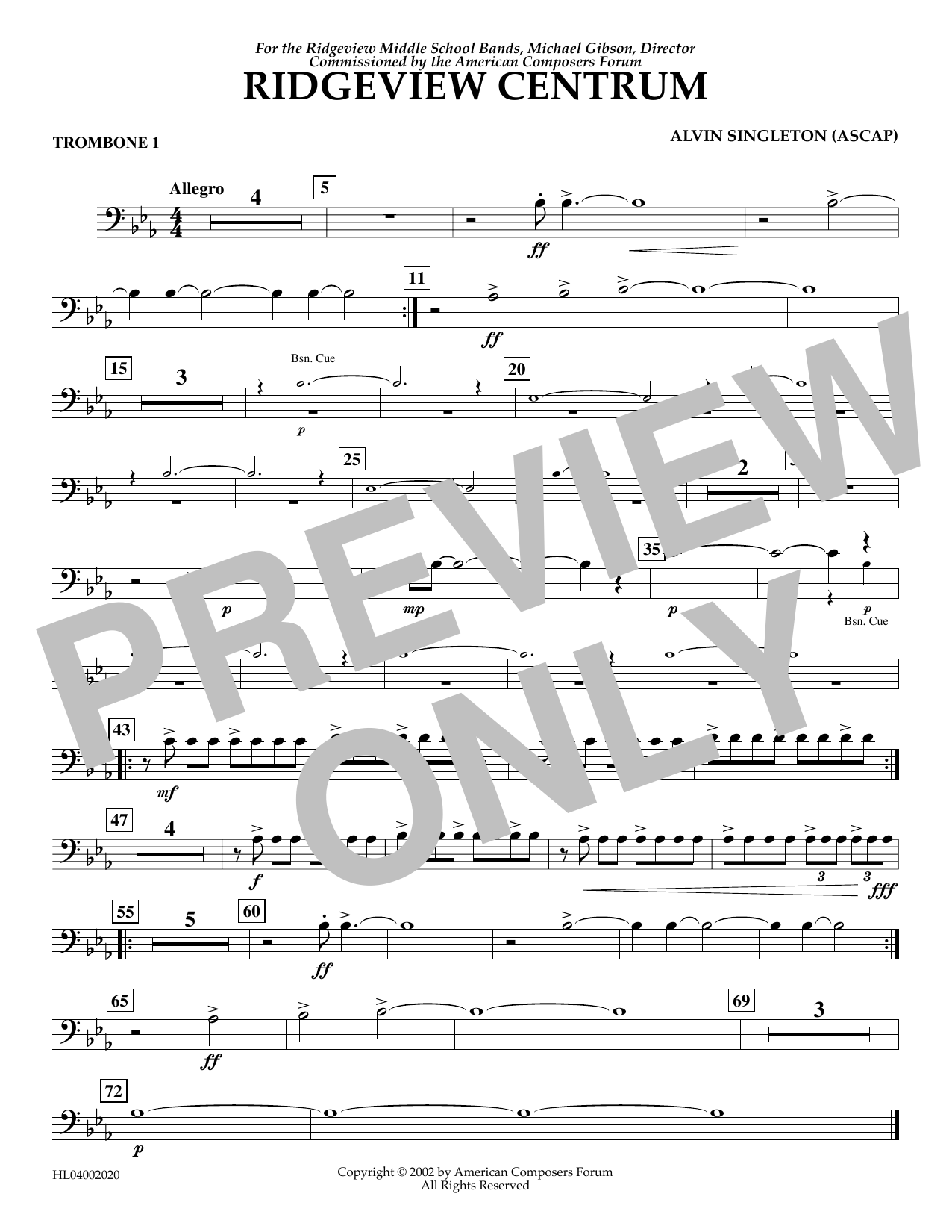 Download or print Alvin Singleton Ridgeview Centrum - Trombone 1 sheet music, chords and digital score arranged for Concert Band. This Concert score includes 1 page(s).