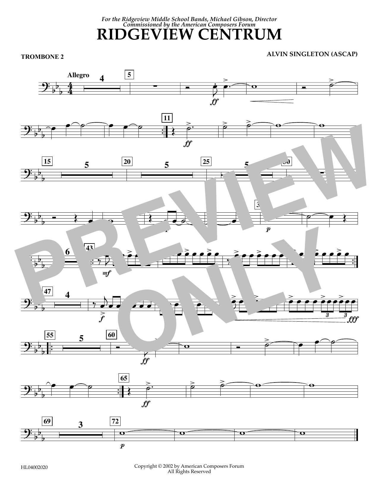 Download or print Alvin Singleton Ridgeview Centrum - Trombone 2 sheet music, chords and digital score arranged for Concert Band. This Concert score includes 1 page(s).