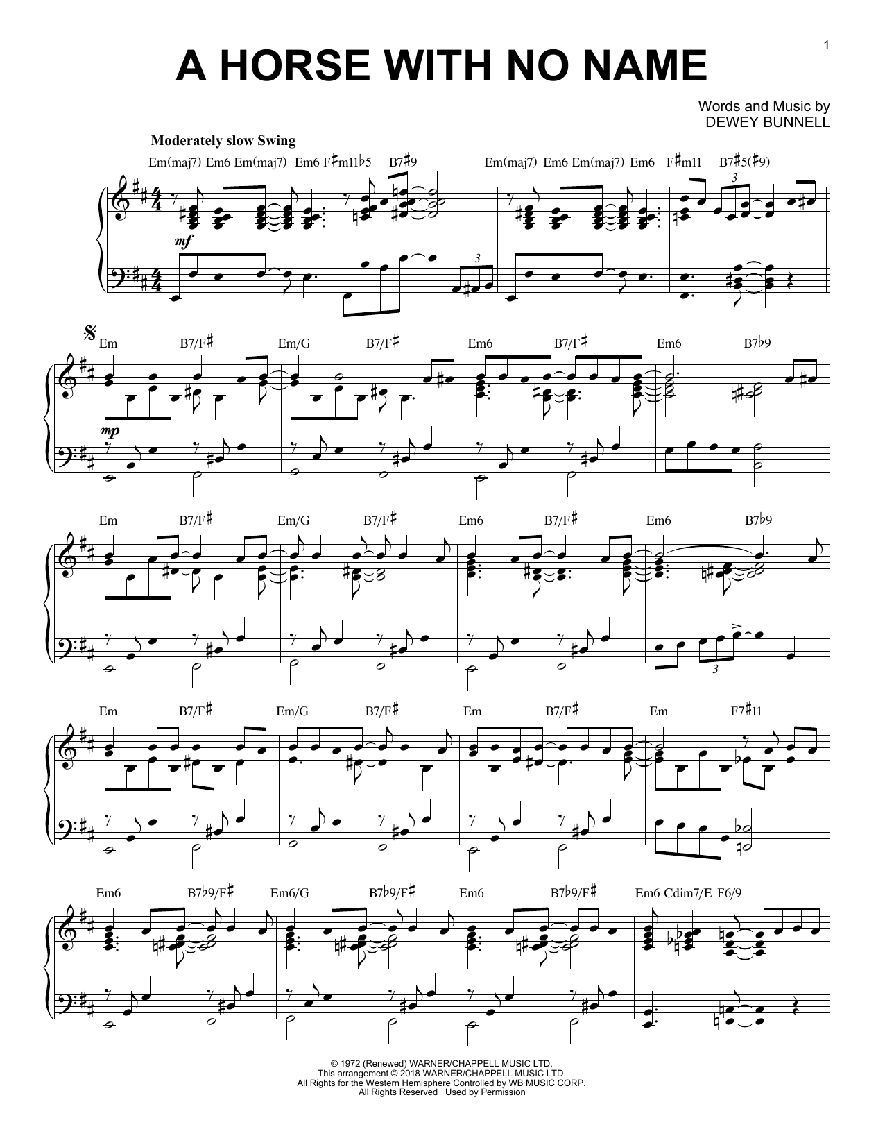 Download or print America A Horse With No Name [Jazz version] sheet music, chords and digital score arranged for Piano Solo. This Pop score includes 4 page(s).