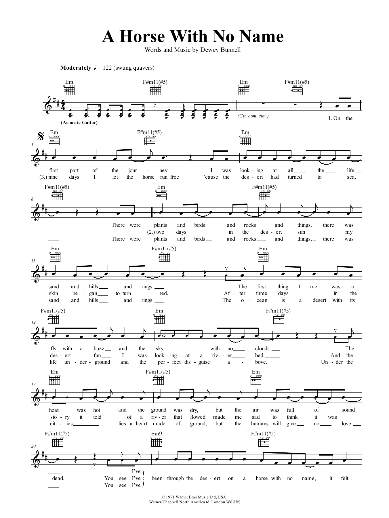 Download or print America A Horse With No Name sheet music, chords and digital score arranged for ChordBuddy. This Pop score includes 2 page(s).