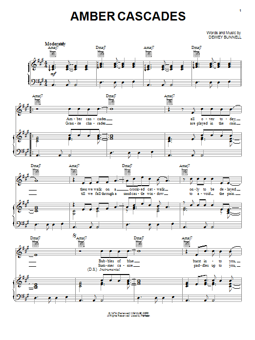 Download or print America Amber Cascades sheet music, chords and digital score arranged for Piano, Vocal & Guitar Chords (Right-Hand Melody). This Pop score includes 3 page(s).