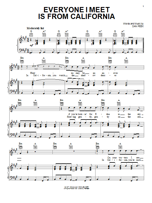 Download or print America Everyone I Meet Is From California sheet music, chords and digital score arranged for Piano, Vocal & Guitar Chords (Right-Hand Melody). This Pop score includes 4 page(s).