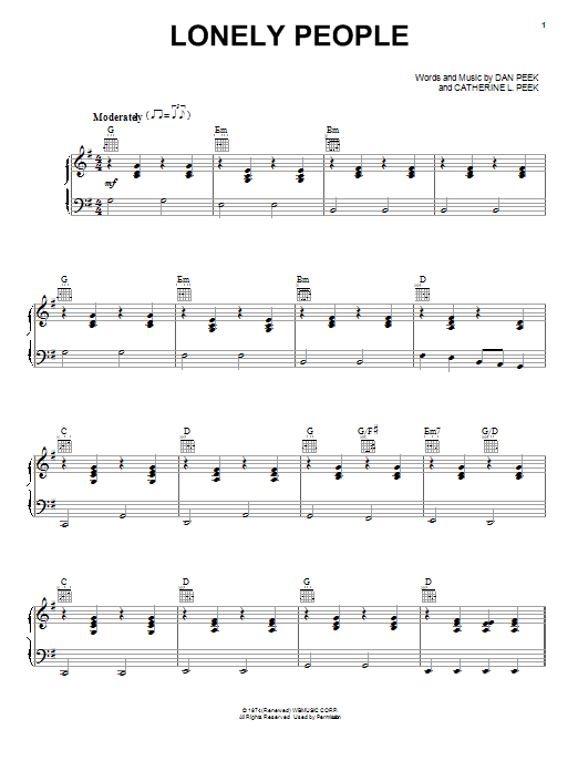 Download or print America Lonely People sheet music, chords and digital score arranged for Baritone Ukulele. This Pop score includes 2 page(s).