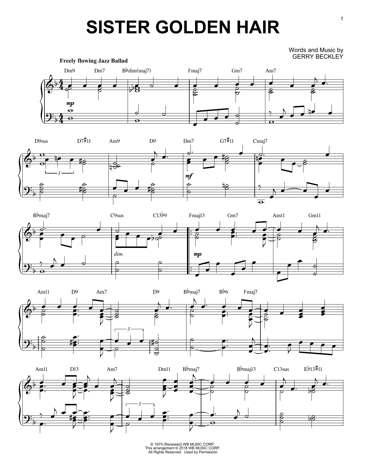 Download or print America Sister Golden Hair [Jazz version] sheet music, chords and digital score arranged for Piano Solo. This Pop score includes 3 page(s).