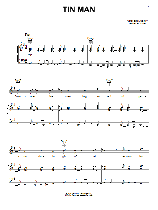 Download or print America Tin Man sheet music, chords and digital score arranged for Easy Piano. This Pop score includes 5 page(s).