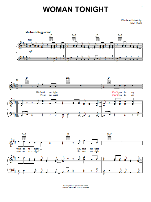 Download or print America Woman Tonight sheet music, chords and digital score arranged for Piano, Vocal & Guitar Chords (Right-Hand Melody). This Pop score includes 3 page(s).