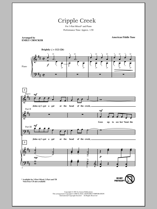 Download or print American Fiddle Tune Cripple Creek (arr. Emily Crocker) sheet music, chords and digital score arranged for 3-Part Mixed Choir. This Concert score includes 11 page(s).