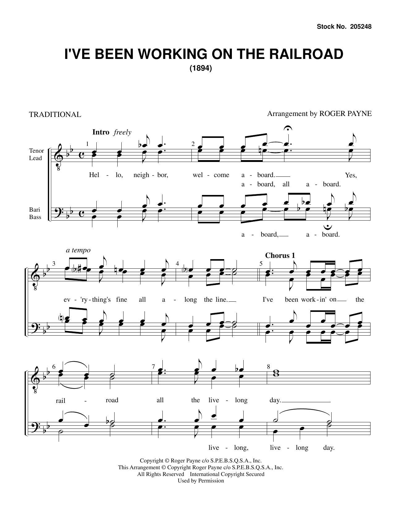 Download or print American Folksong I've Been Working on the Railroad (arr. Roger Payne) sheet music, chords and digital score arranged for TTBB Choir. This Barbershop score includes 5 page(s).