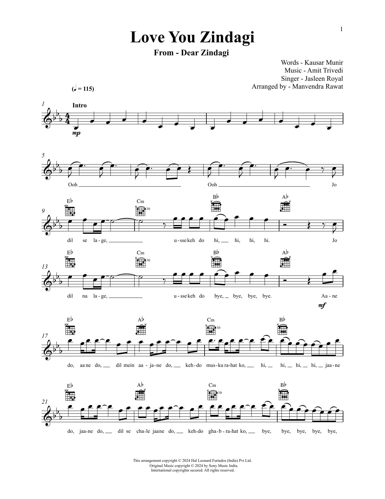 Download or print Amit Trivedi and Jasleen Royal Love You Zindagi (from Dear Zindagi) sheet music, chords and digital score arranged for Lead Sheet / Fake Book. This Hindi score includes 3 page(s).