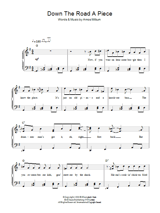 Download or print Amos Milburn Down The Road A Piece sheet music, chords and digital score arranged for Beginner Piano (Abridged). This Blues score includes 2 page(s).